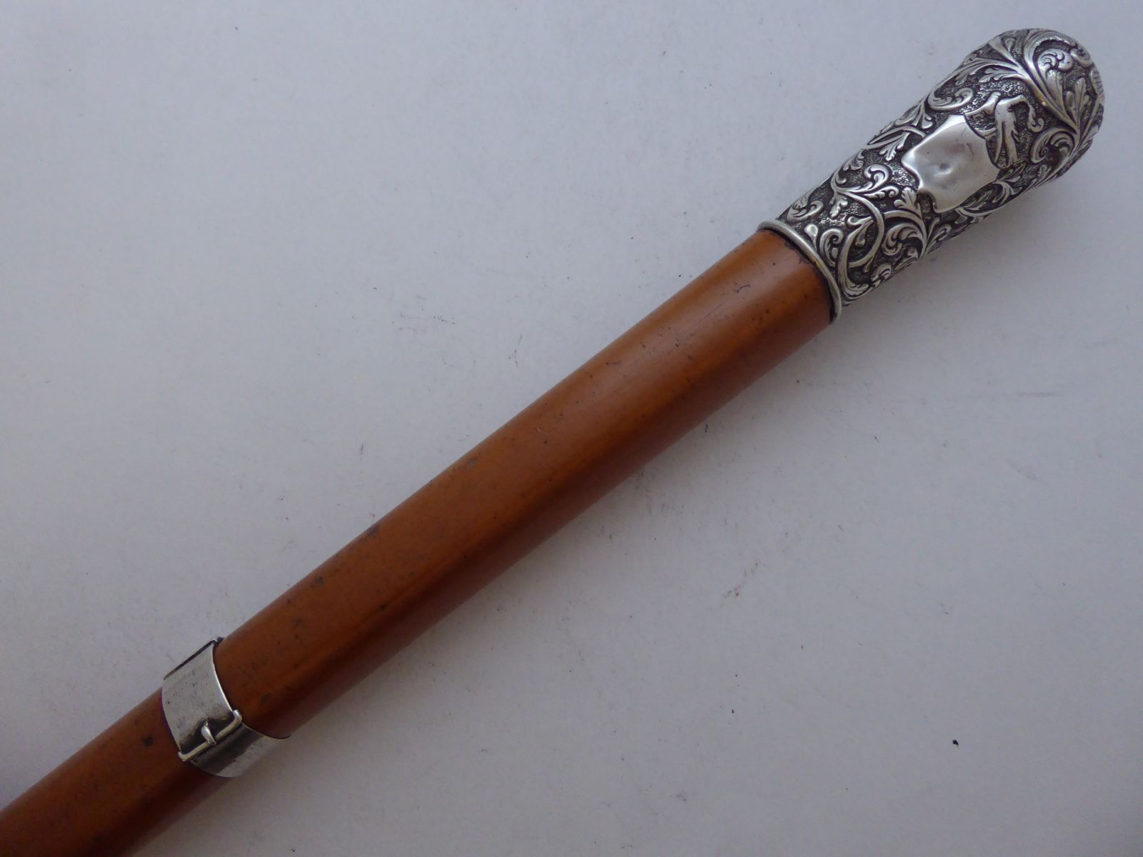 Victorian Walking Stick Cane Silver Pommel Malacca Wood Shaft Thistle Peacock