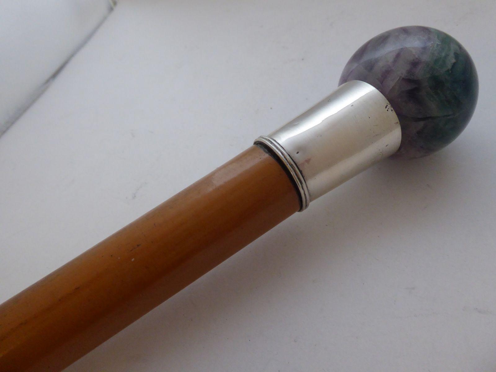 Victorian Walking Stick Cane Solid Silver Pommel Malacca Wood Shaft Fluorite Top