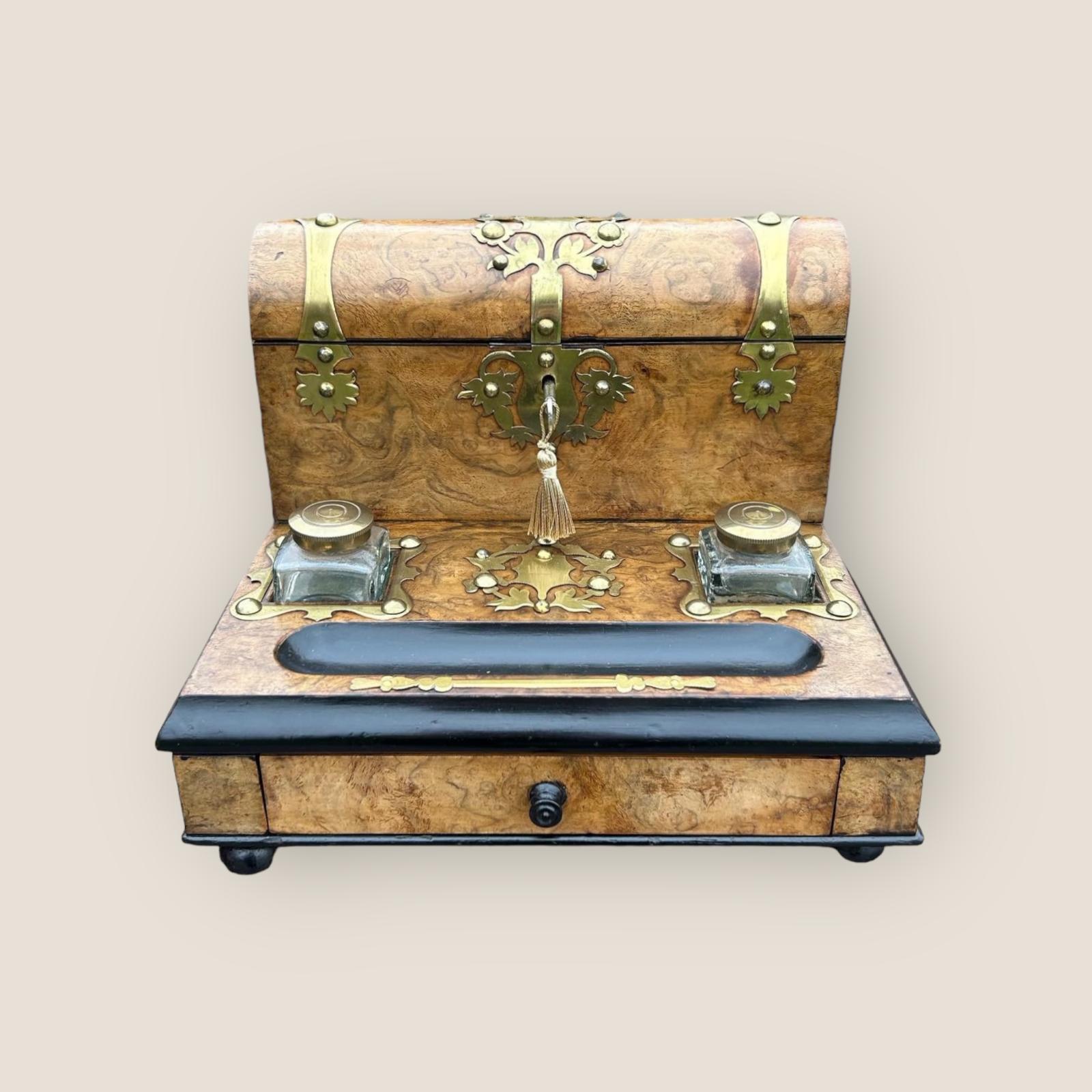 Victorian Walnut & Brass Inkwell Stand with Dome Topped Box