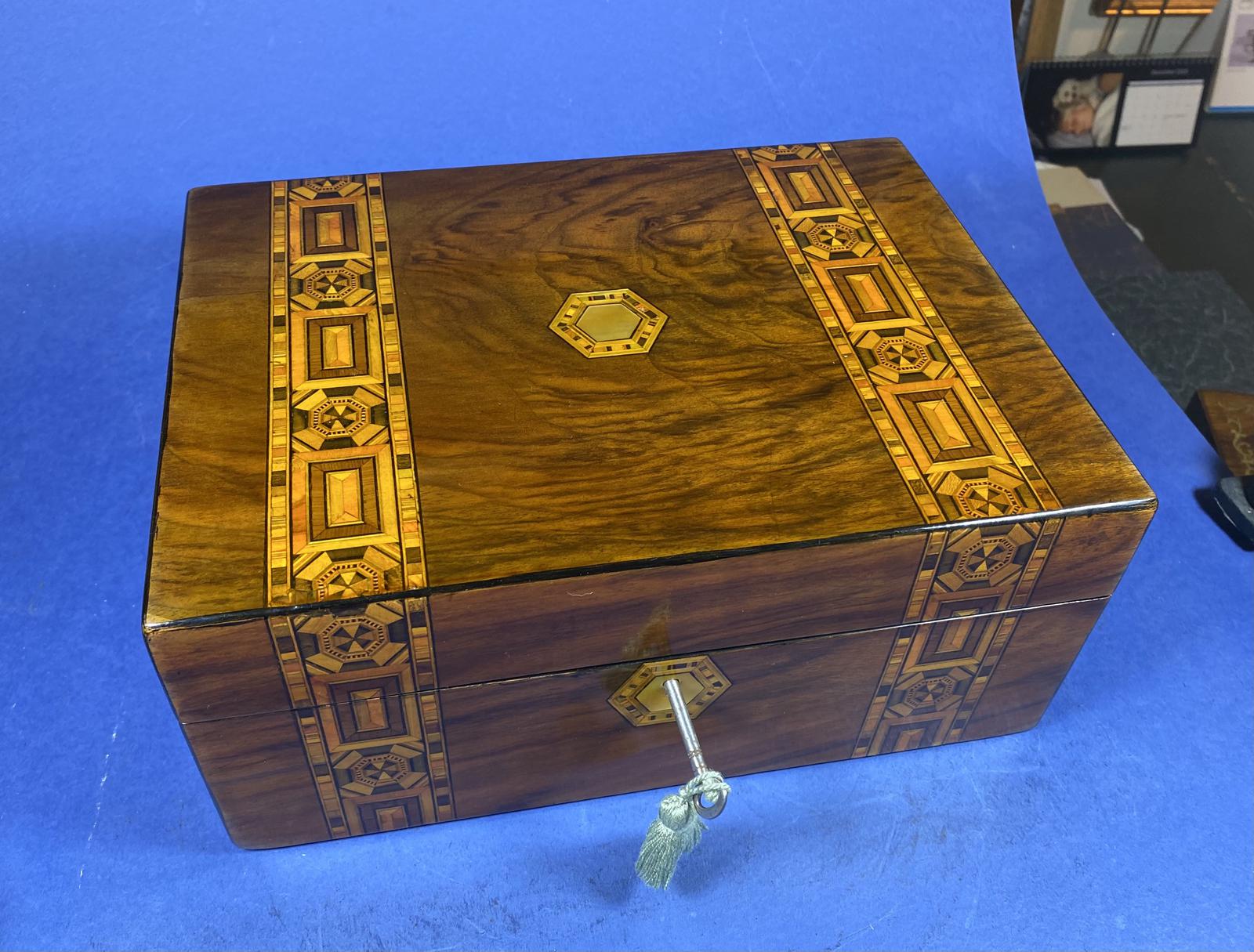 Victorian Walnut Jewellery Box With Tunbridge Ware Inlay.