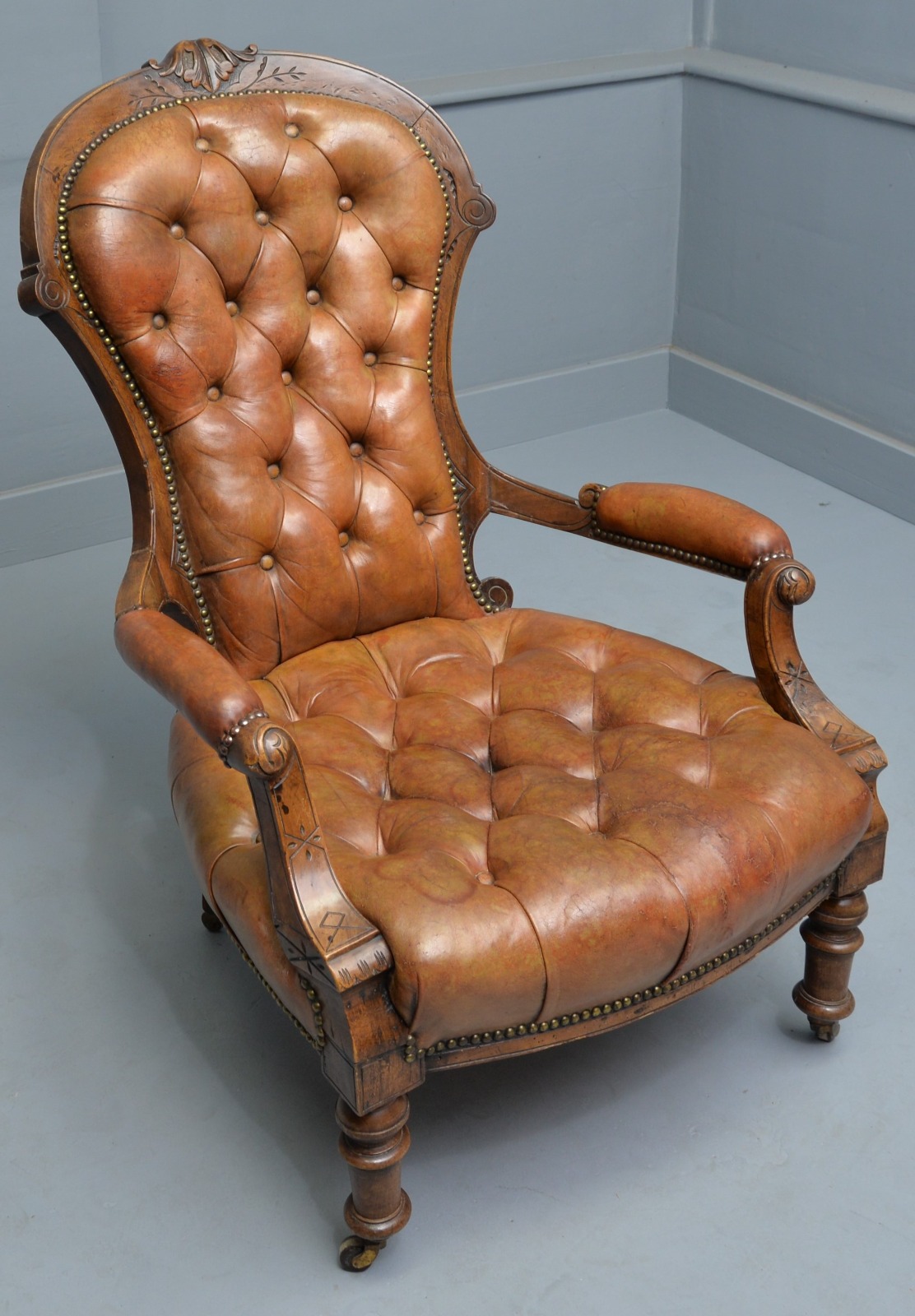 Victorian Walnut & Original Leather Spoon-Back Armchair