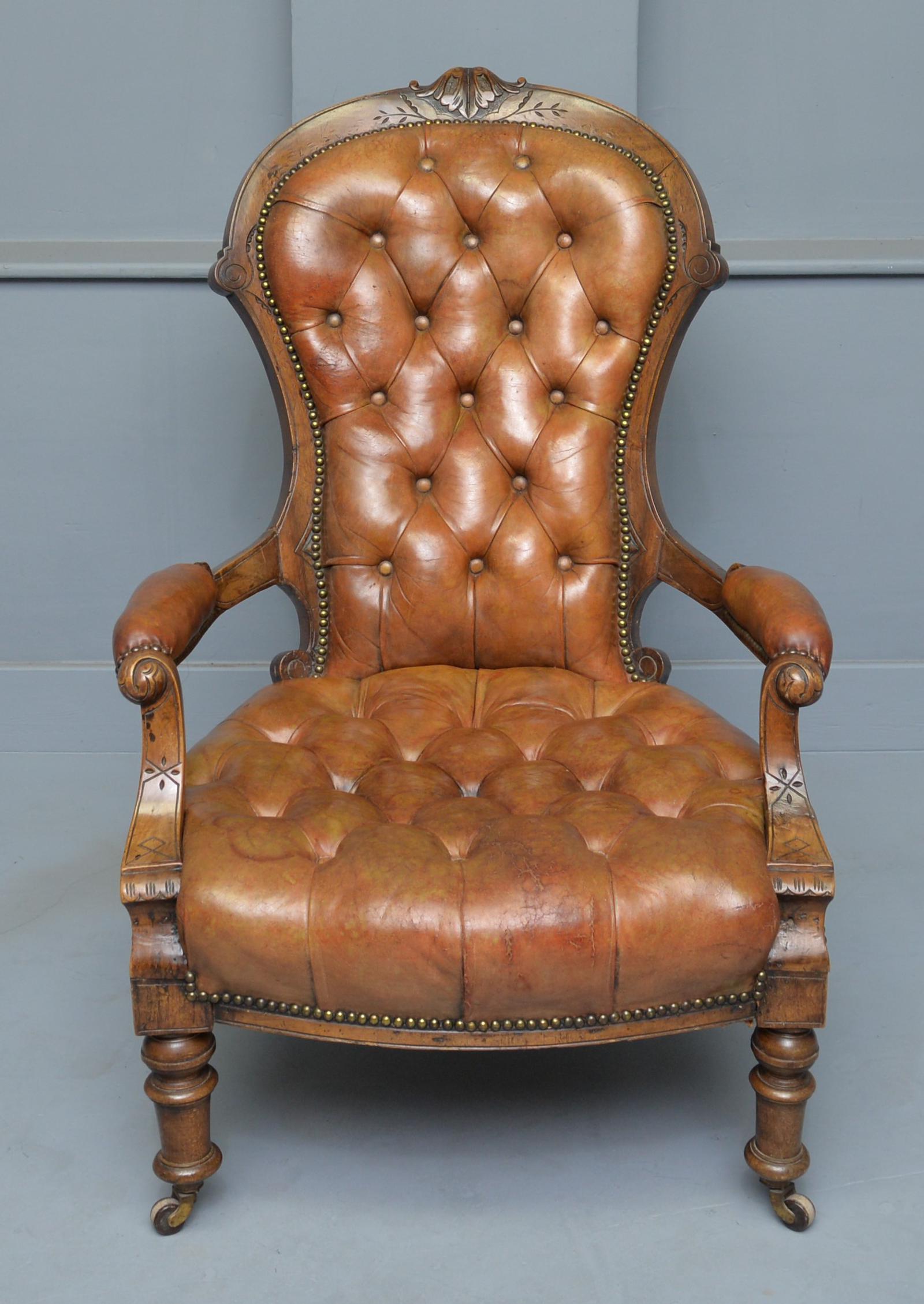 Victorian Walnut & Original Leather Spoon-back Armchair