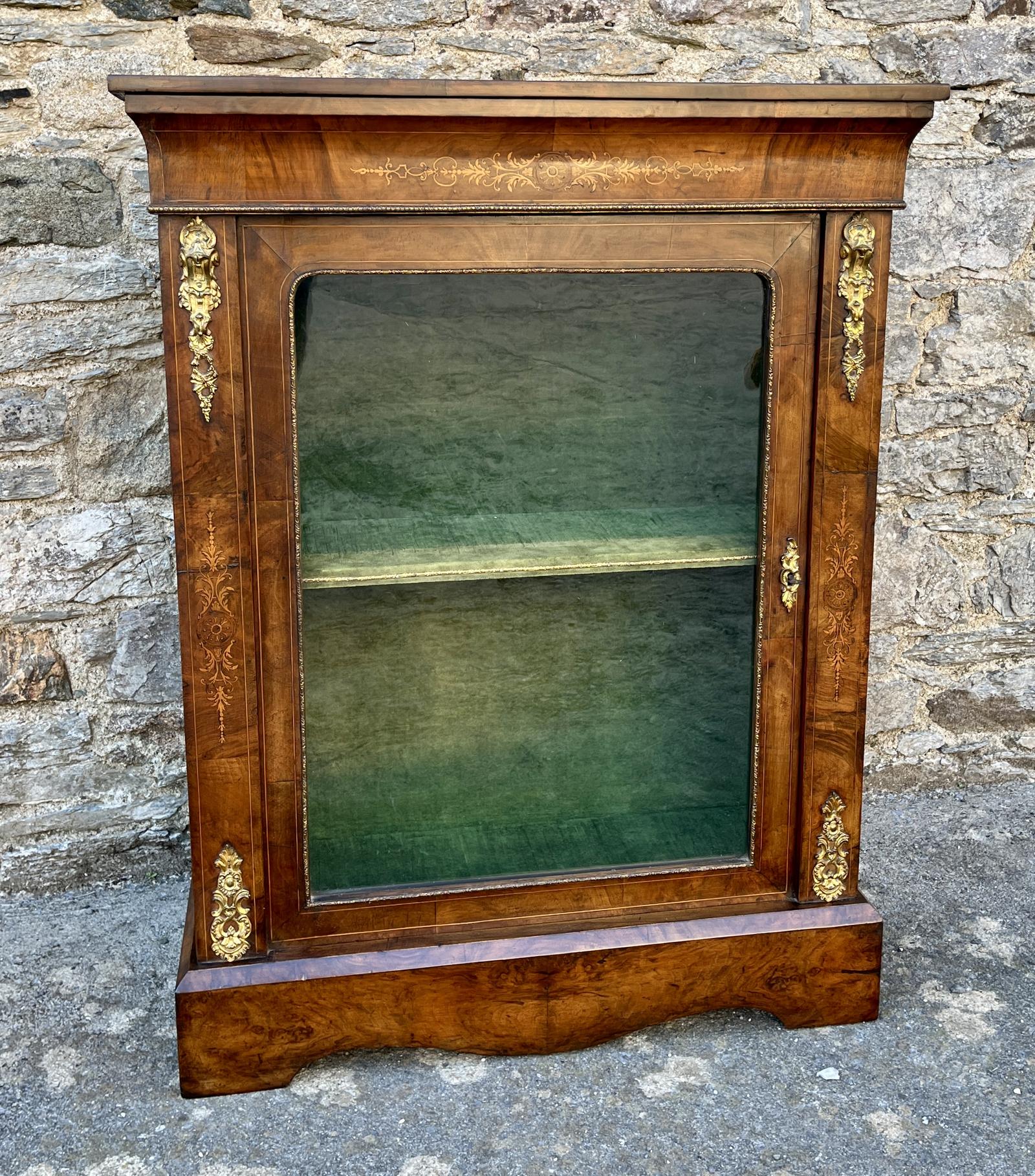 A superb Victorian walnut pier cabinet of small proportions, dating from the mid to late 19th Century. It is excellent quality with pretty ormolu mounts and inlaid decoration. The glazed door opens to a shelved interior lined with the original green velvet and ormolu beading across the front of the shelf.