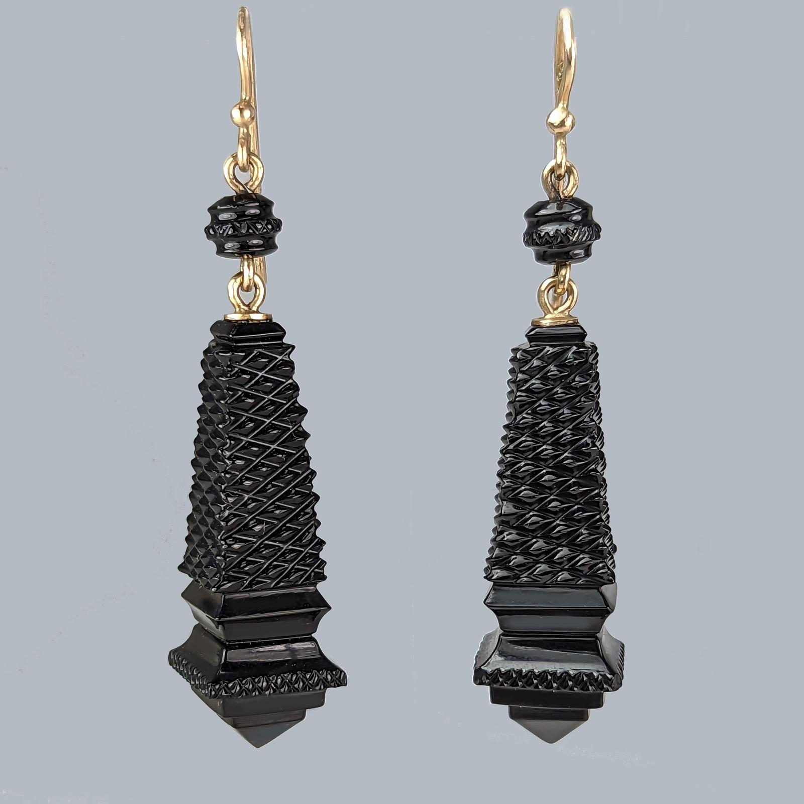 Victorian Whitby Jet Drop Earrings Antique Carved Jet Dangle Earrings c.1870