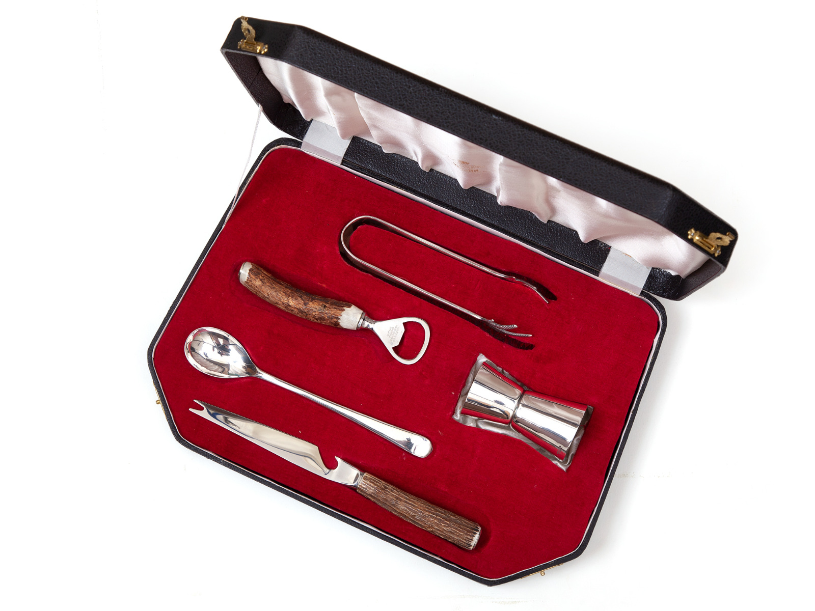 Viners Boxed Silver Plate and Stag Handle Bar Tool Set