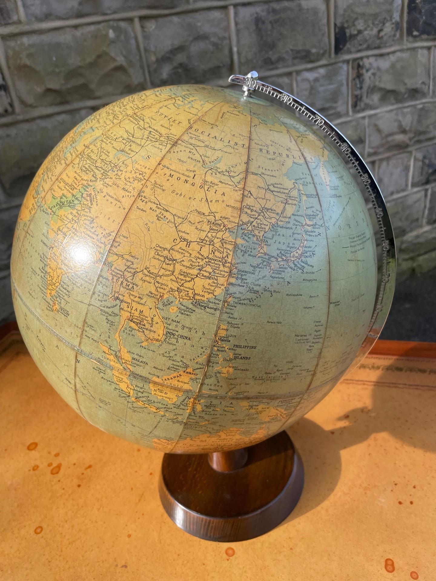 Offered for sale is this vintage Philips 13.5" challenge globe on turned walnut stand.
