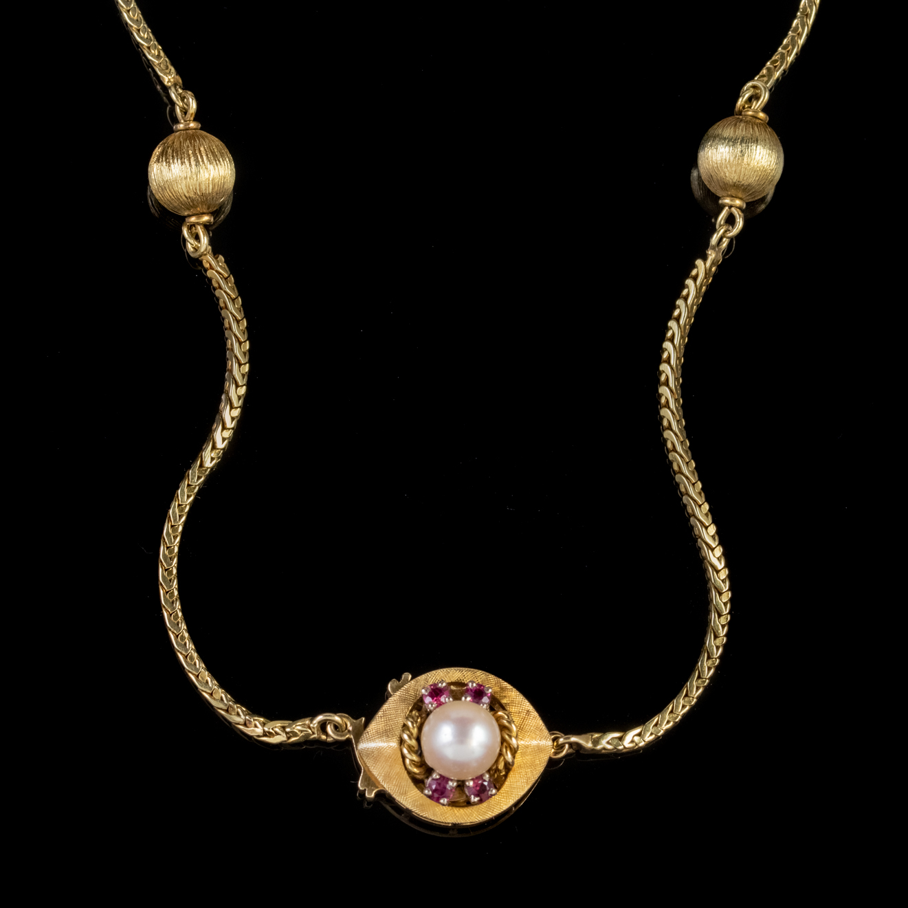 Vintage 14ct Gold Ball Chain Necklace Pearl Ruby Clasp c.1960