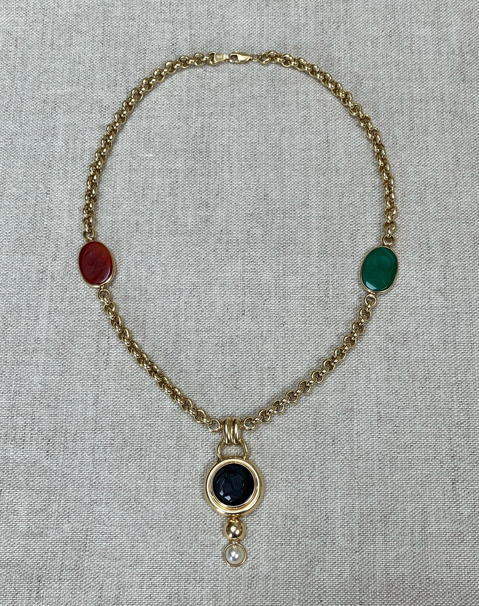 Vintage 14ct Gold Intaglio Carnelian, Chrysoprase, Onyx, Pearl Necklace, Belcher Chain