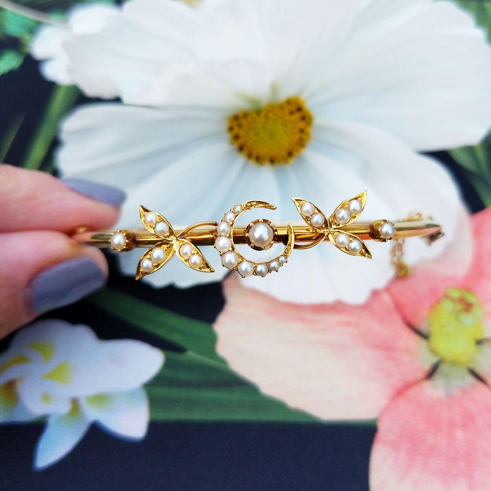 Vintage 14ct Yellow Gold Crescent Moon Pearl Bangle