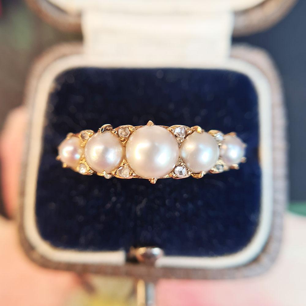 Vintage 18ct Gold Five Cultured Pearl & Diamond Ring, Original Case