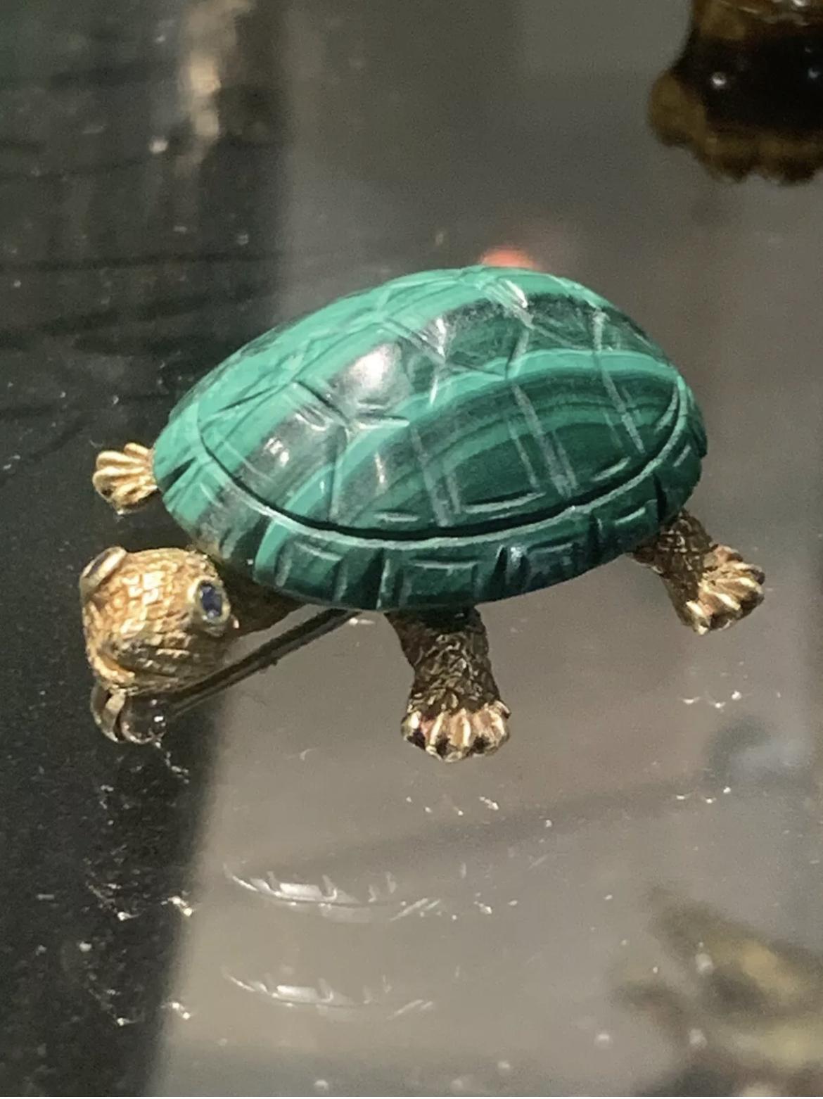 Vintage 18ct Gold & Gem-set Sapphires Malachite Carved Tortoise Brooch