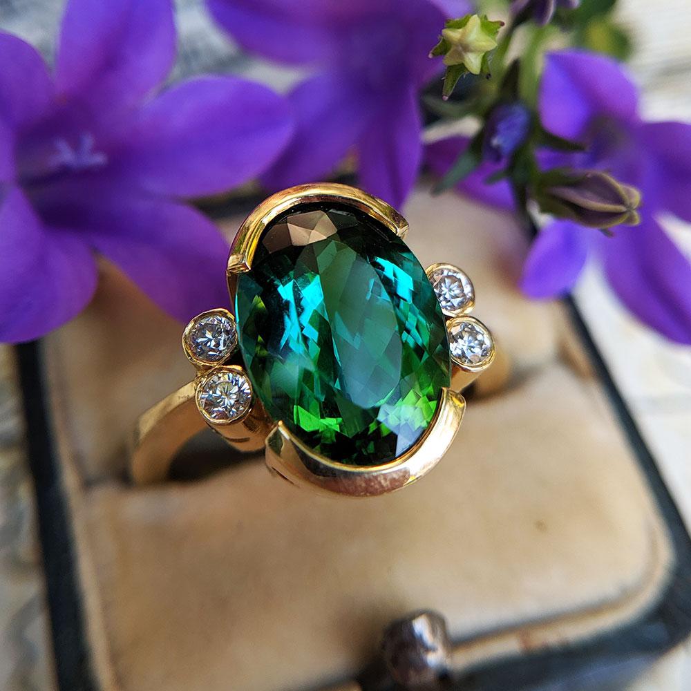 Vintage 18ct Gold Green Tourmaline & Diamond Dress Ring