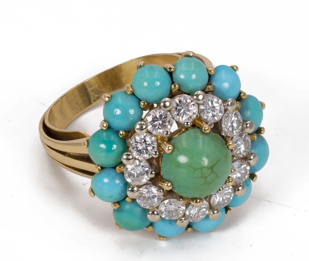 Vintage 18K Gold, Brilliant Cut Diamond & Turquoise Ring, 1960s