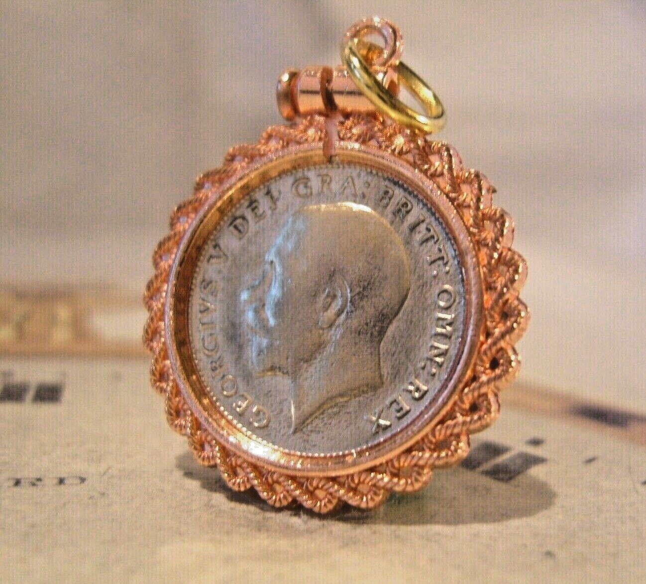 Vintage 1924 Silver Sixpence Pocket Watch Chain Fob in Ornate Rose Gilt Mount