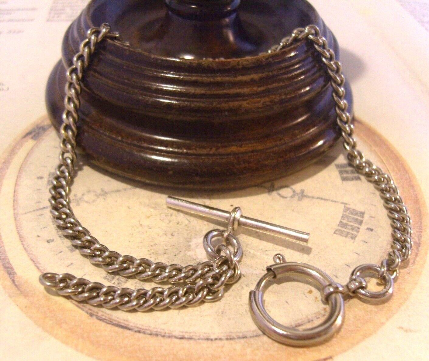 Vintage 1930s Pocket Watch Chain Silver Nickel Albert With T Bar & Bolt Ring