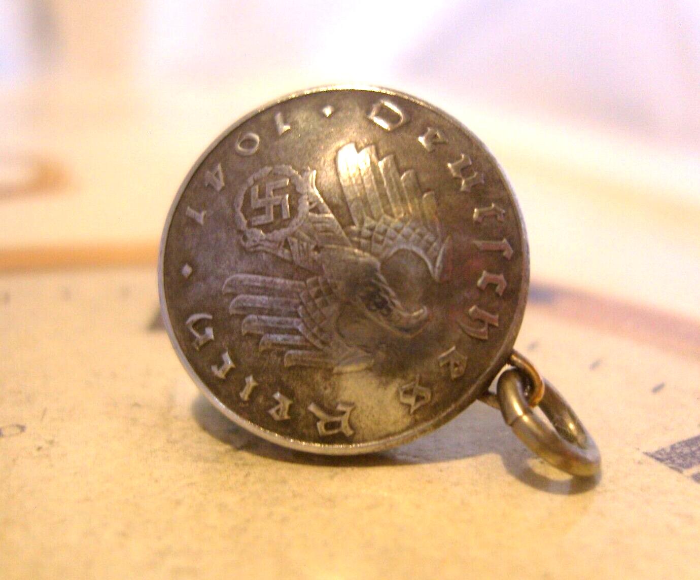 Vintage 1941 WW2 Pocket Watch Chain German Reich 10 Pfennig Domed Coin Fob