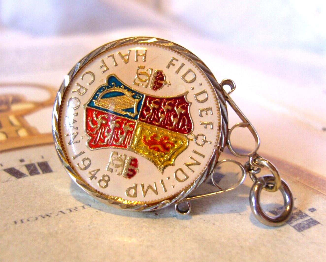 Vintage 1948 Multi Enamel Lucky Half Crown Pocket Watch Chain Large Coin Fob