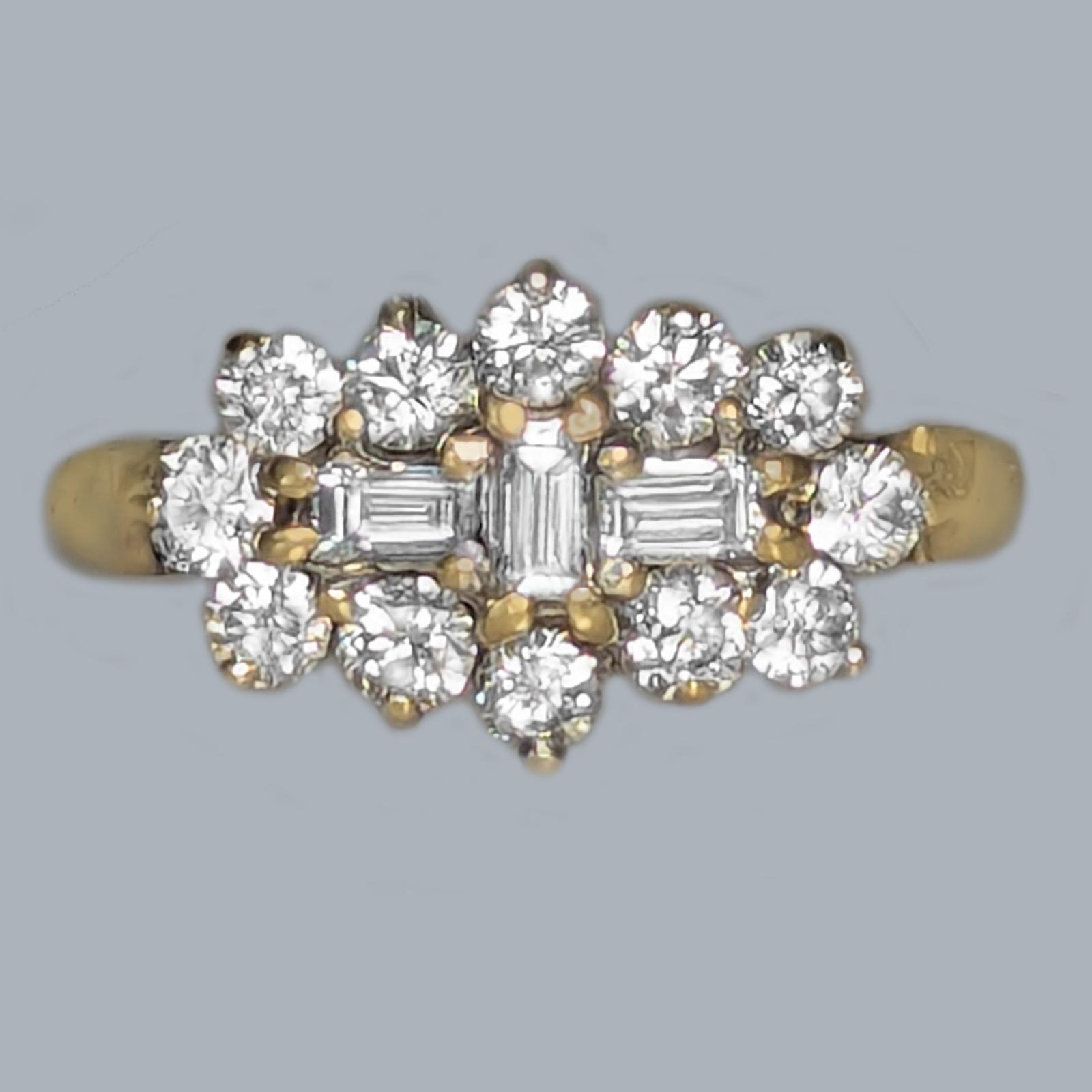 Vintage 1950s Diamond Cluster Ring in 18ct Gold with Baguette & Brilliant Cut Diamonds