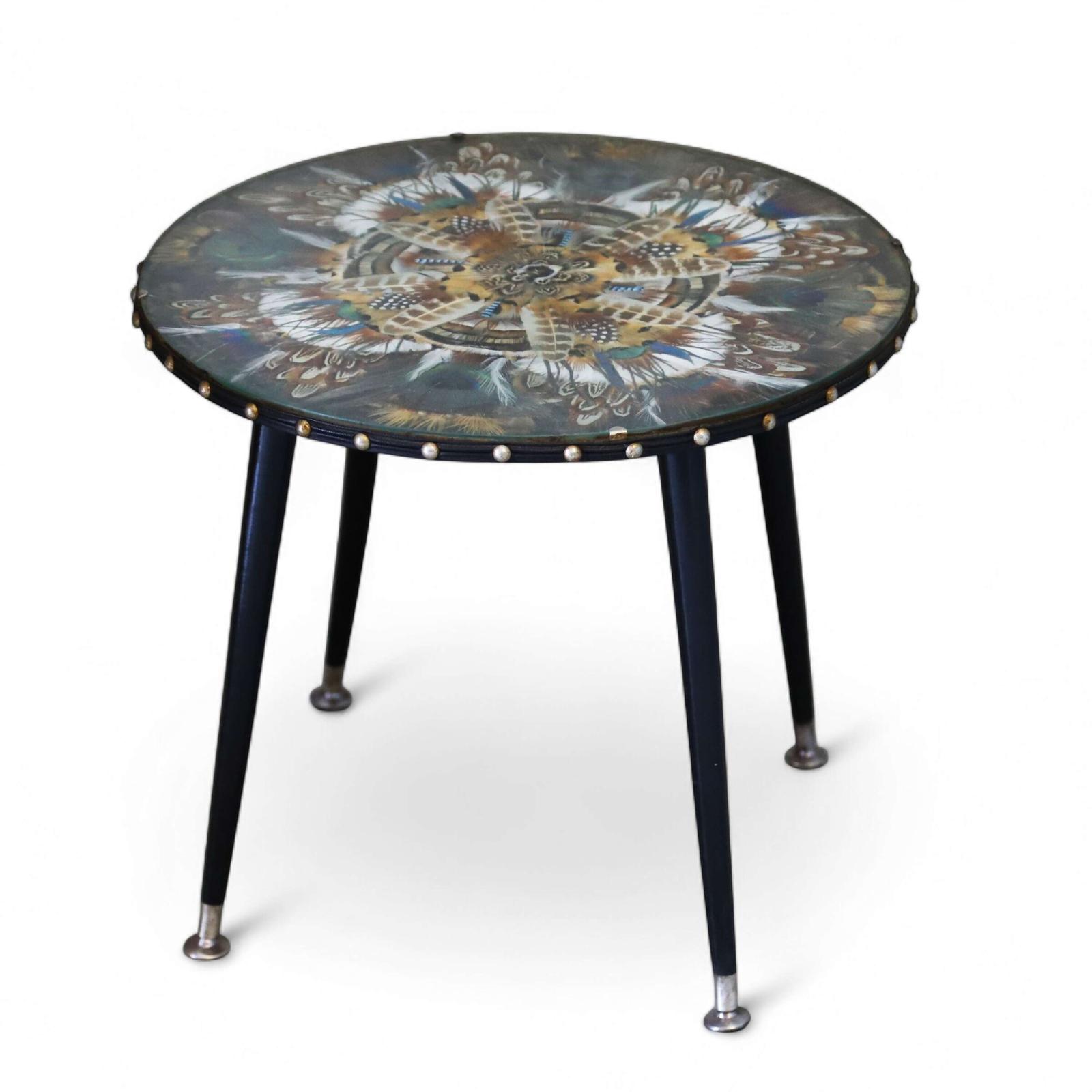 A striking and unusual mid-century occasional table, dating to the 1950s. The circular top features an intricately arranged feather collage, set beneath glass, creating a richly detailed, iridescent surface alive with the natural patterning of the feathers. The circumference is finished with stud detailing, adding texture and subtle industrial character.