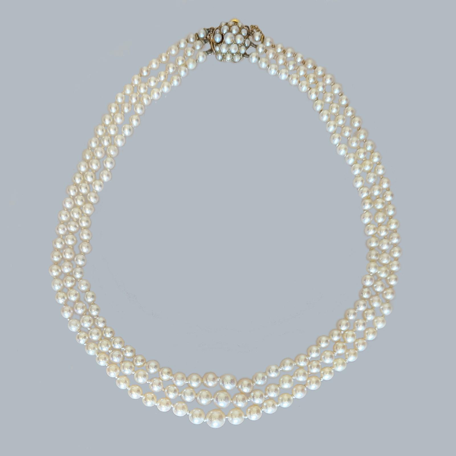 Vintage 1950s Triple-strand Cultured Pearl Necklace with 9ct Gold Cluster Clasp A Timeless and Elegant Design in Excellent Condition (1 of 7)