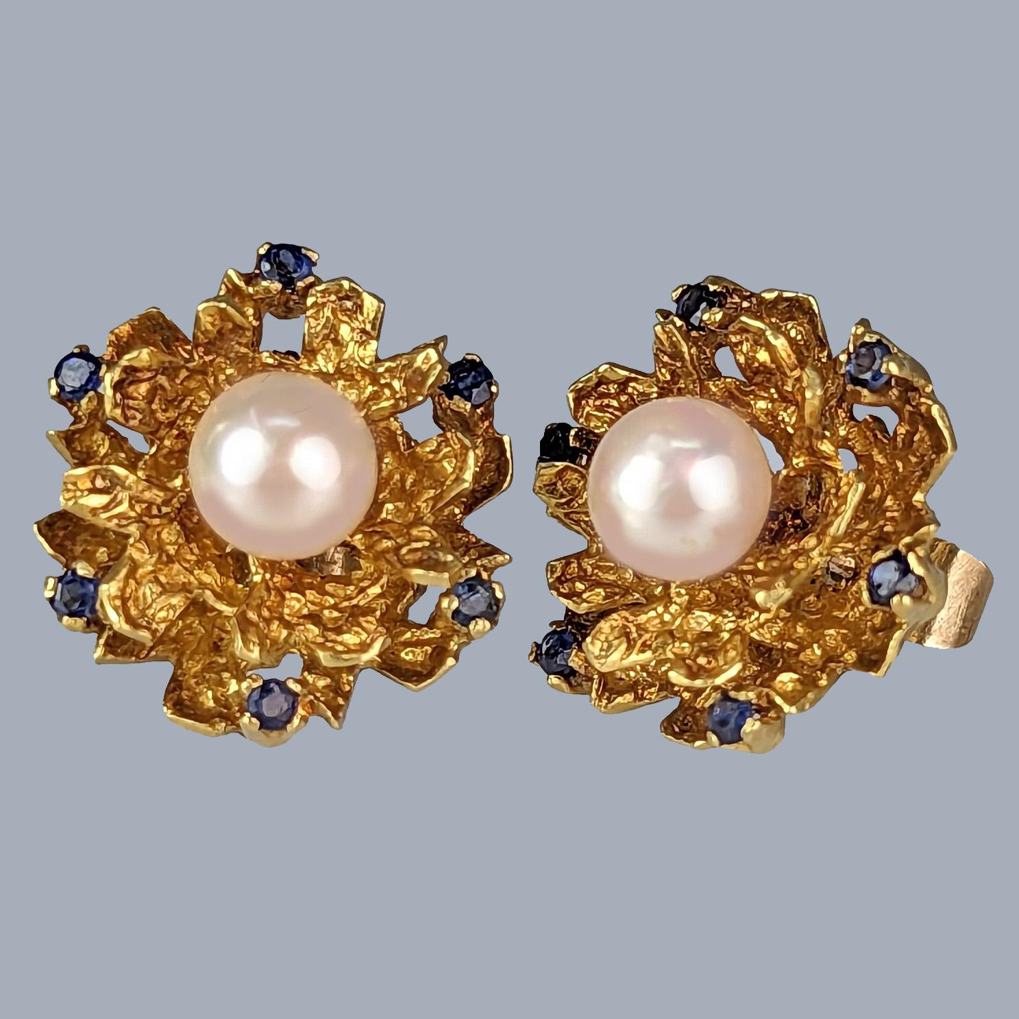 Vintage 1960s Pearl & Sapphire Earrings – Floral Cluster in 18ct Gold, Post Fittings