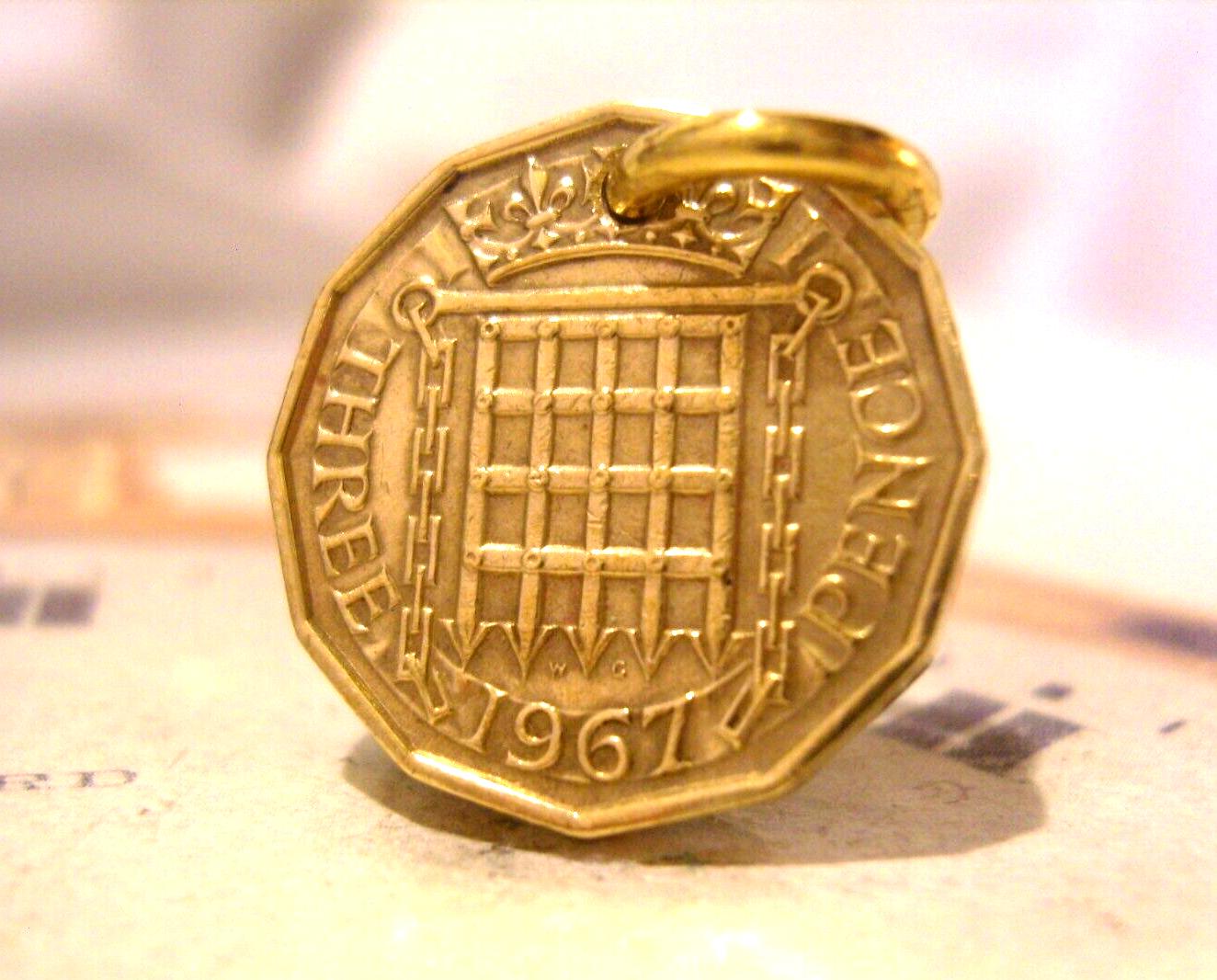 Vintage 1967 Pocket Watch Chain Fon Queen Elizabeth Threppenny Bit 3d Coin Fob