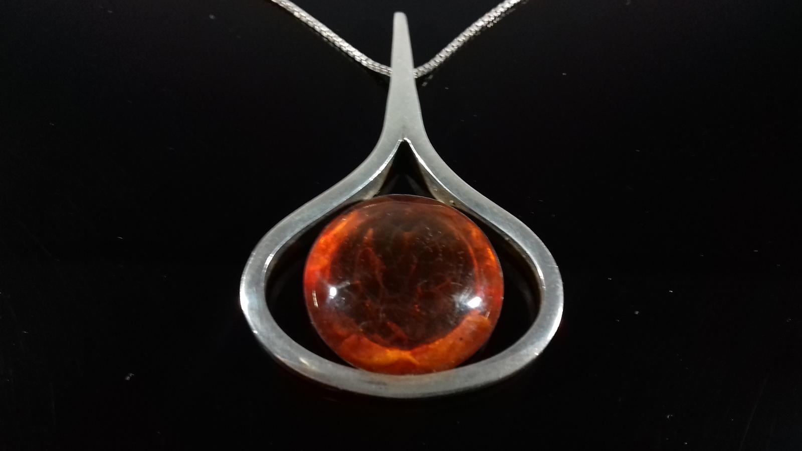 Vintage 1970s Denmark 925 Silver Amber Large Modernist Pendant Necklacet Henning Ulrichsen