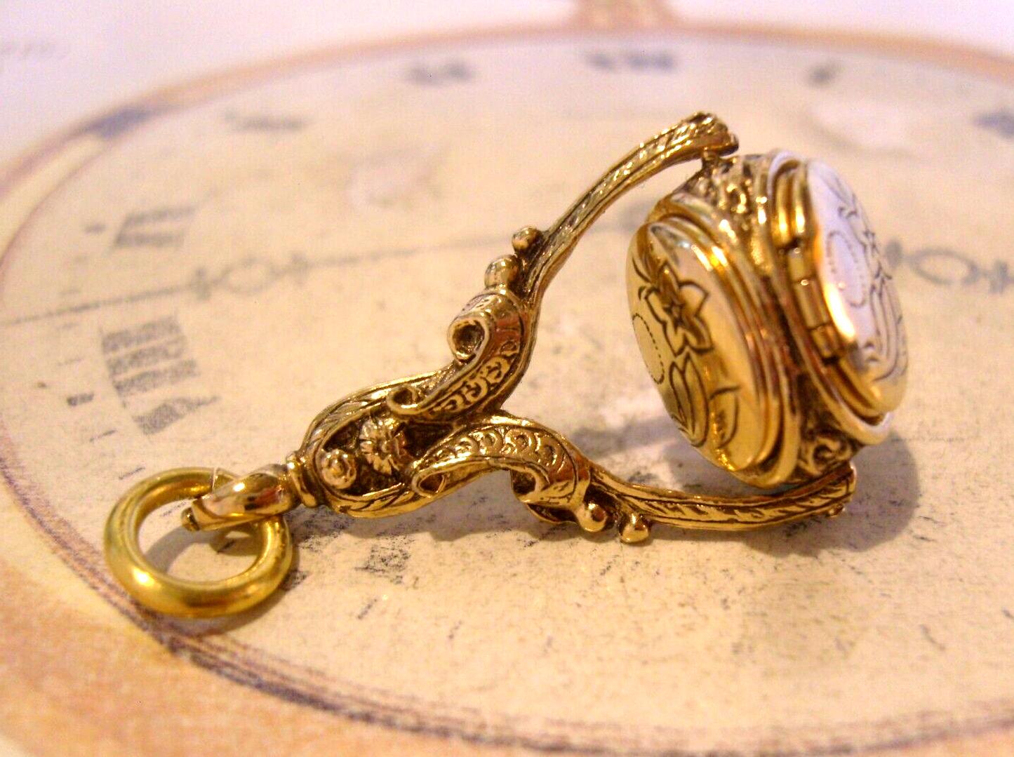 Vintage 1970s Pocket Watch Chain Triple Photograph Fob Large Ornate Gilt Fob
