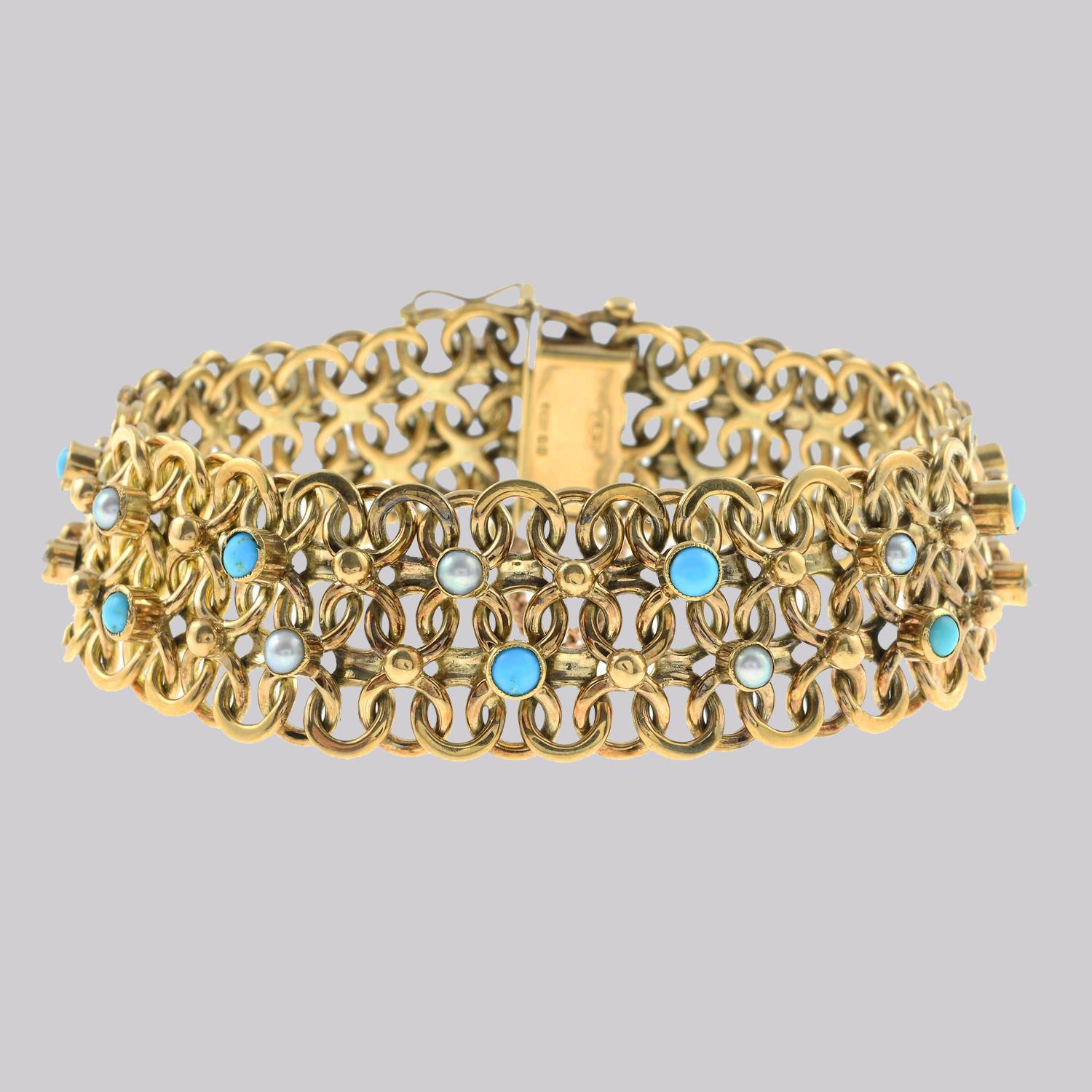 Vintage 1980s Cropp & Farr Turquoise and Pearl Bracelet 9ct Gold Birmingham 1984 Hallmarks