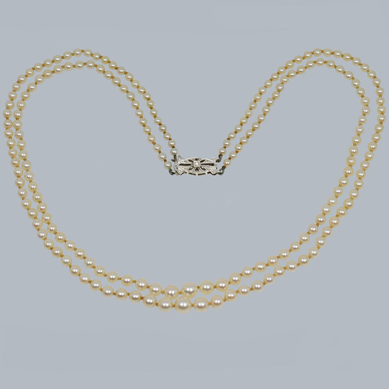 Vintage 2 Row Pearl Necklace 9ct Gold Diamond Clasp 1950s Double Strand Pearls Hallmarked Birmingham 1955