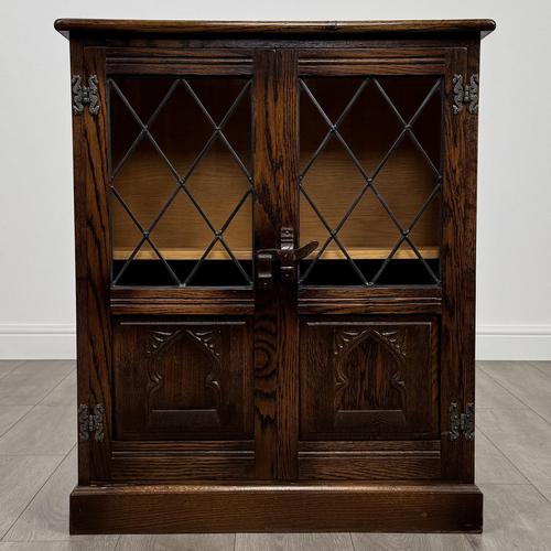 This vintage 20th century small oak cabinet is a beautiful and practical piece, standing elegantly on a plinth base. It features two glazed doors that reveal a single adjustable shelf inside, providing versatile storage or display space. Crafted by the renowned “Webber Furniture,” this cabinet exemplifies exceptional quality and fine craftsmanship. The oak showcases a magnificent grain and rich colour throughout, enhanced by subtle carving details on the front that add a touch of understated elegance. In great condition, this desirable example is perfect for adding timeless charm to any home.