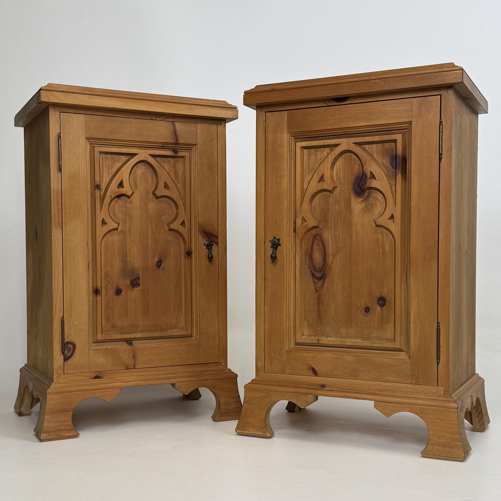 A vintage 20th century pair of Gothic bedside cabinets in pine, a very attractive and highly decorative matching set.