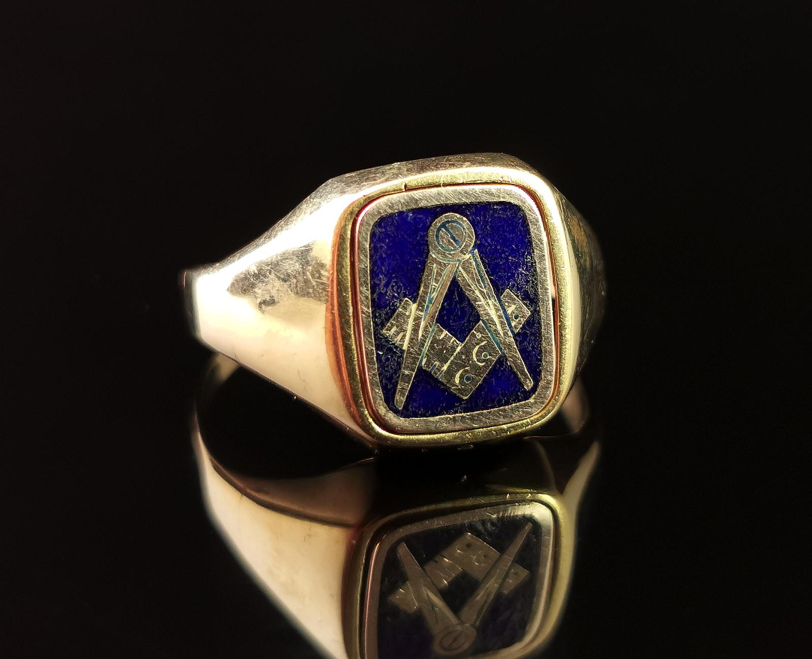 Vintage 9ct Gold Masonic Swivel Ring, Signet, Blue Enamel