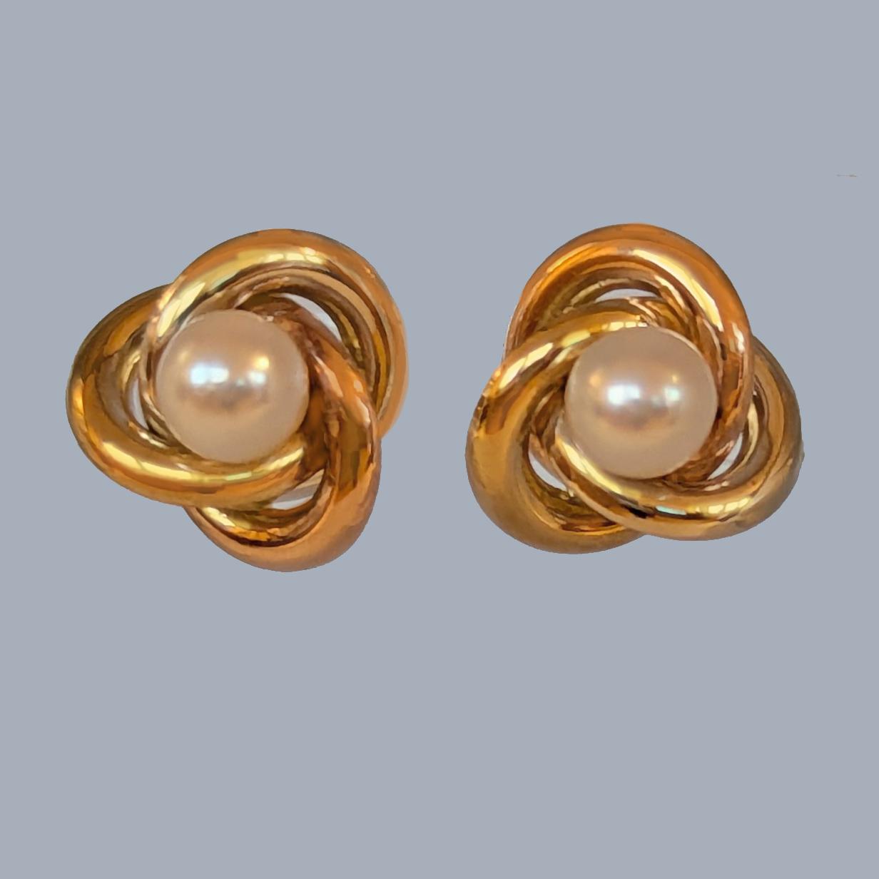 A beautifully graceful pair of vintage pearl earrings, crafted in solid 9ct gold and dating to the 1960s. Each earring is centred with a luminous cultured pearl of soft creamy ivory tone, framed by an attractive swirl of three intertwining gold ribbons that form a refined floral motif.