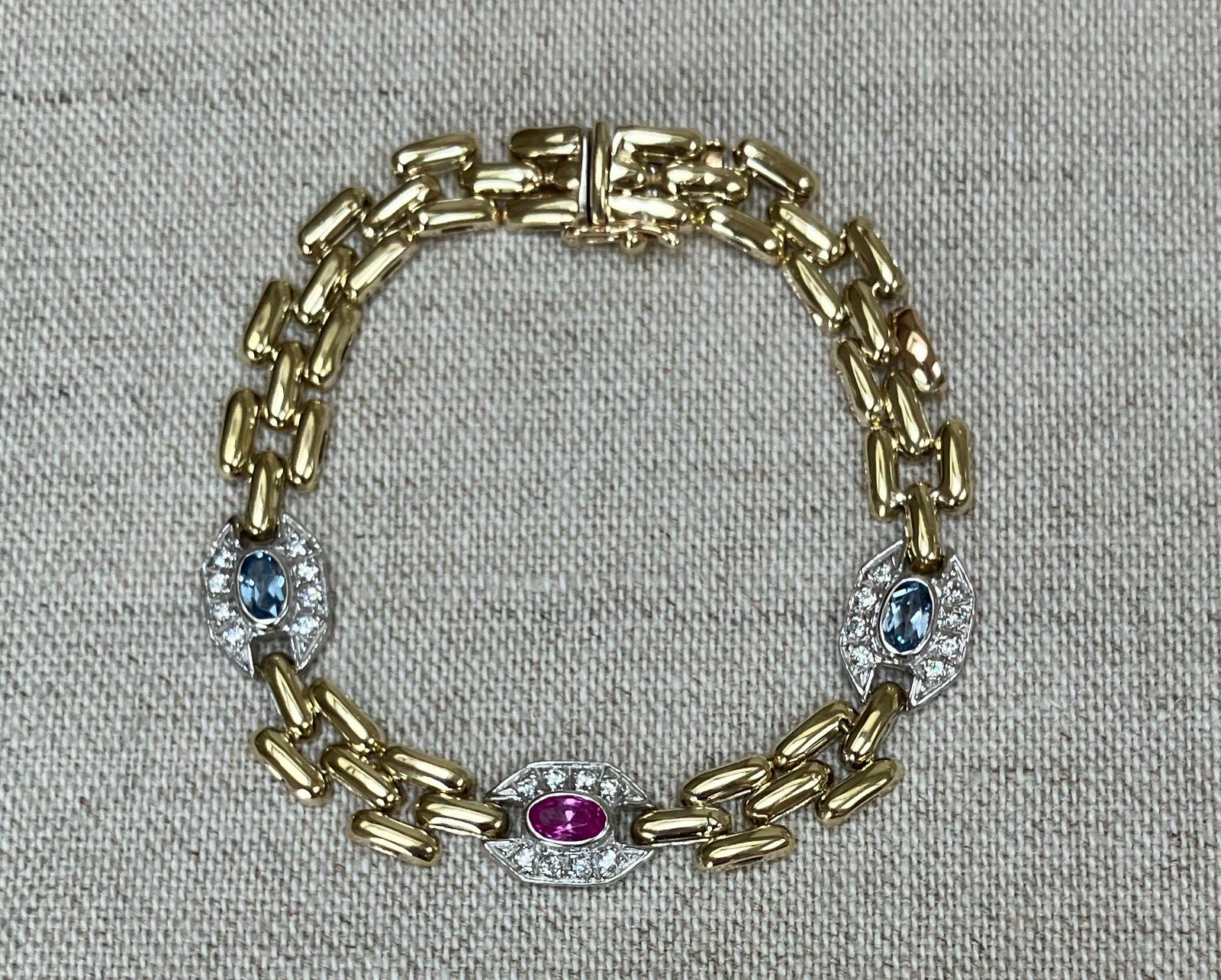 Vintage 9ct Gold Pink & Blue Topaz Brick Link Bracelet