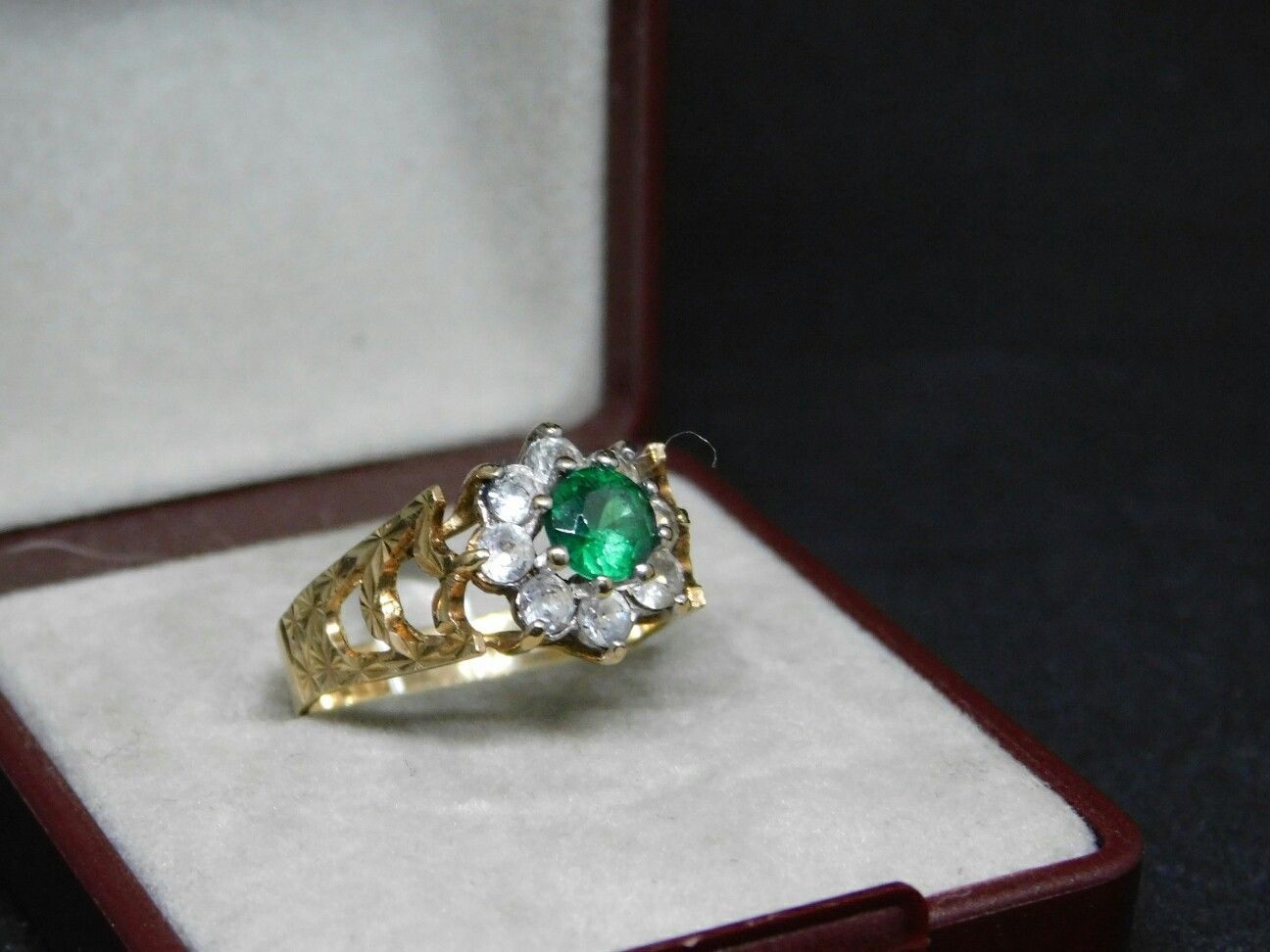 Vintage 9ct Yellow Gold 7 Stone Emerald Flower Cluster Occasion Ring