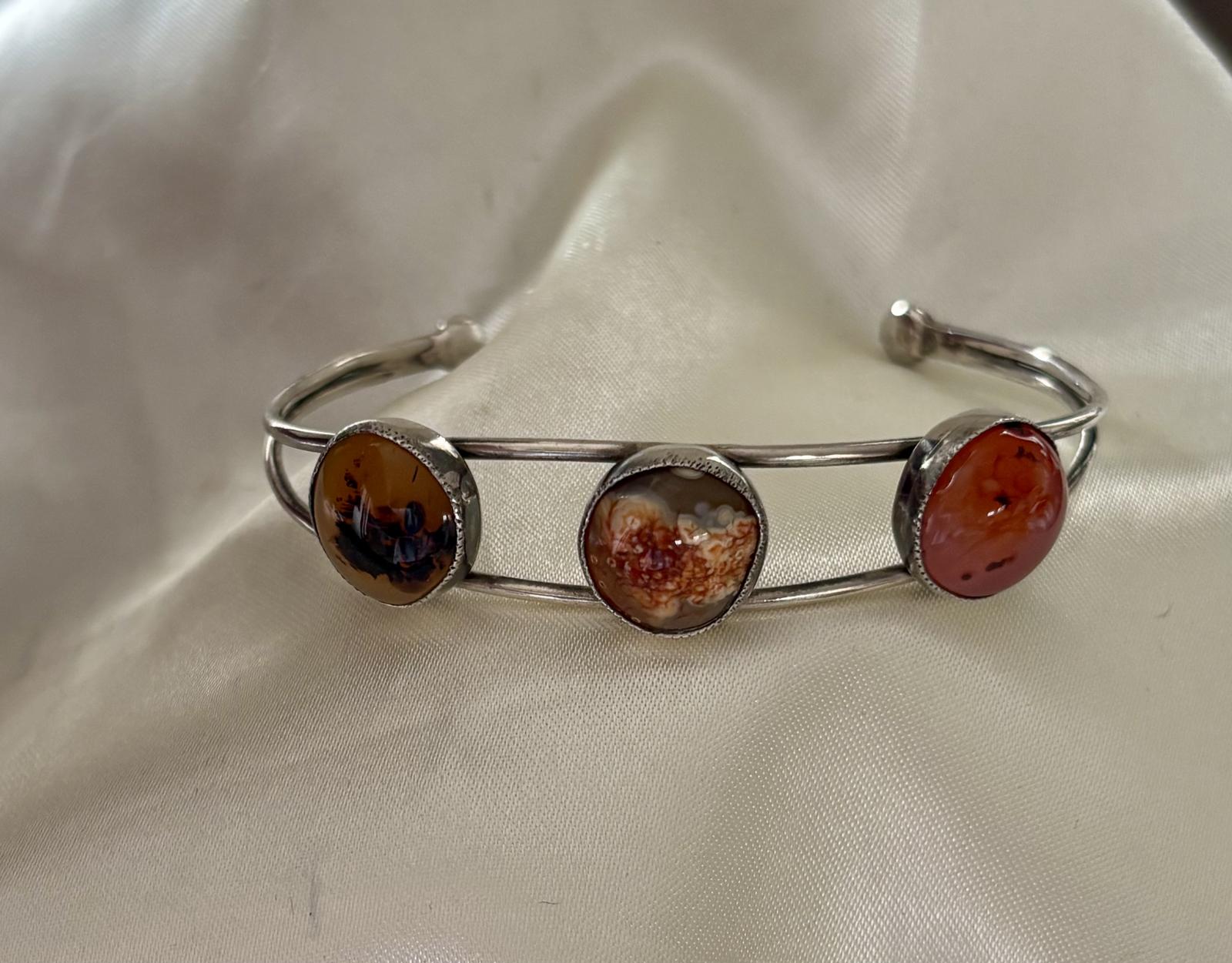 This is a gorgeous silver torque bangle set with three different agates which are set in silver surrounds. The bangle has some age and is marked “sterling”. The agates are all round and slightly misshapen making it a unique piece. Very good preowned condition, please see all photos for details.