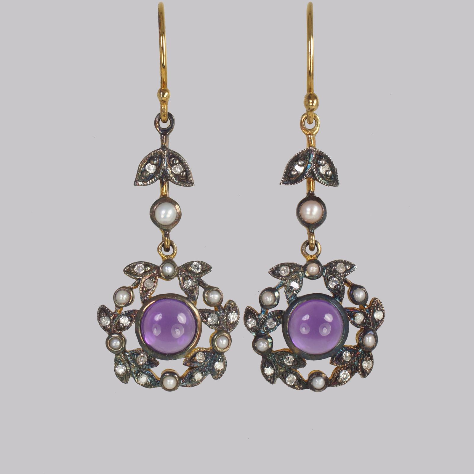 Vintage Amethyst Diamond & Pearl Drop Earrings 18ct Gold Victorian Style Dangle Earrings