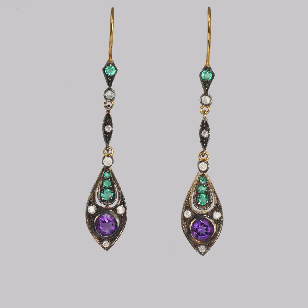 Vintage Amethyst Emerald & Diamond Suffragette Coloured Edwardian Style Dangle Earrings (1 of 4)