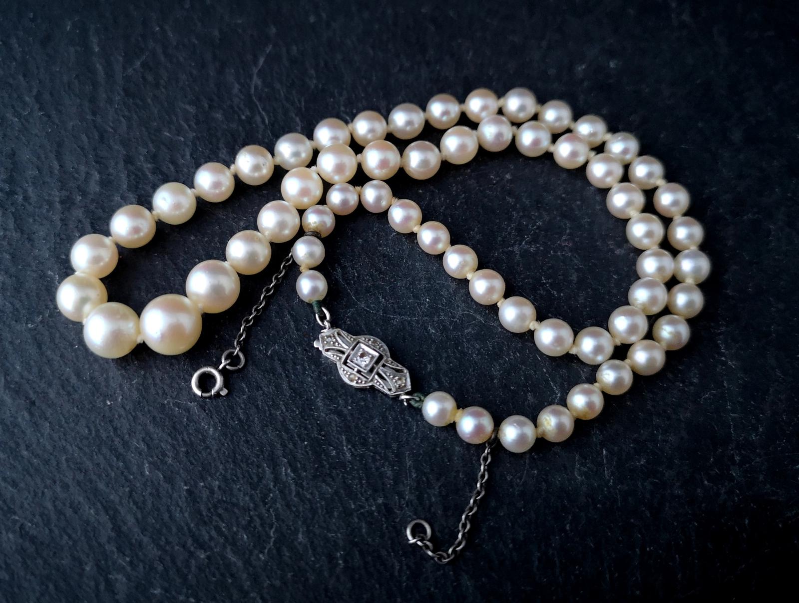 Vintage Art Deco Pearl Necklace, Diamond, 14k White Gold