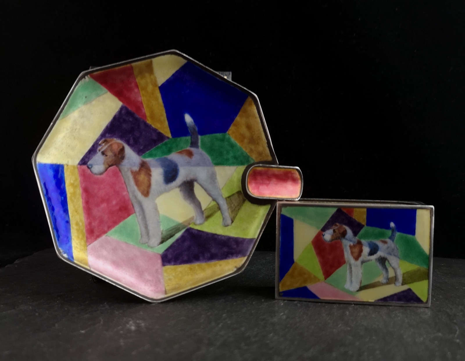 Vintage Art Deco Silver & Enamel Smokers Set, Fox Terrier