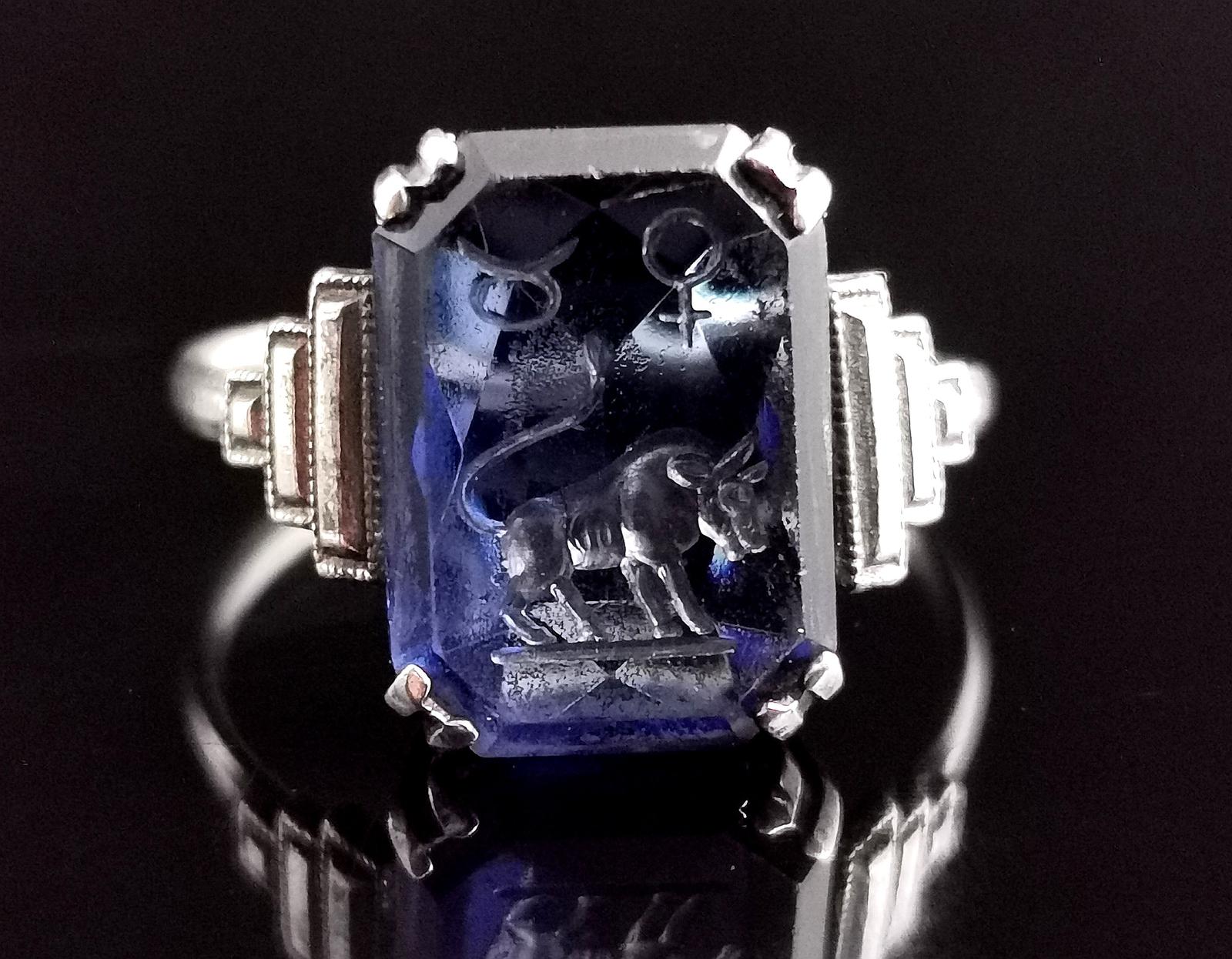 Vintage Art Deco Zodiac Intaglio Ring, Sterling Silver, Taurus