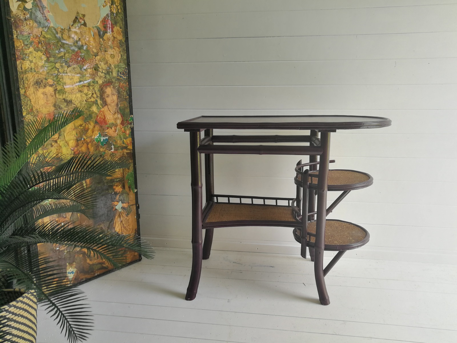 Vintage Bamboo & Rattan Oval Hand Painted Bar Cart Drinks Table Side Table