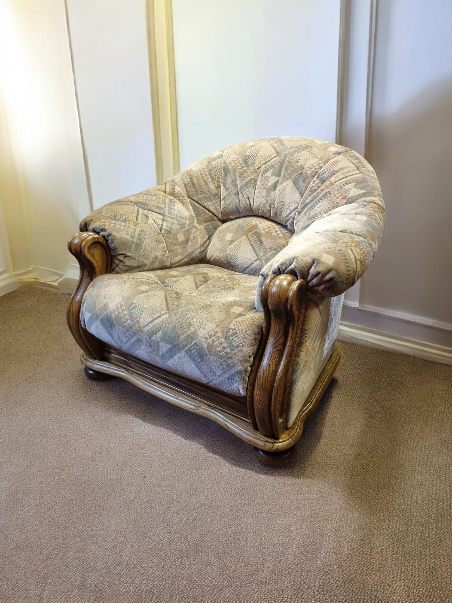 The upholstery features a subtle geometric pattern in muted tones, paired with solid carved wooden arms and base a great statement piece for a living room, snug, reading corner or boutique interior.