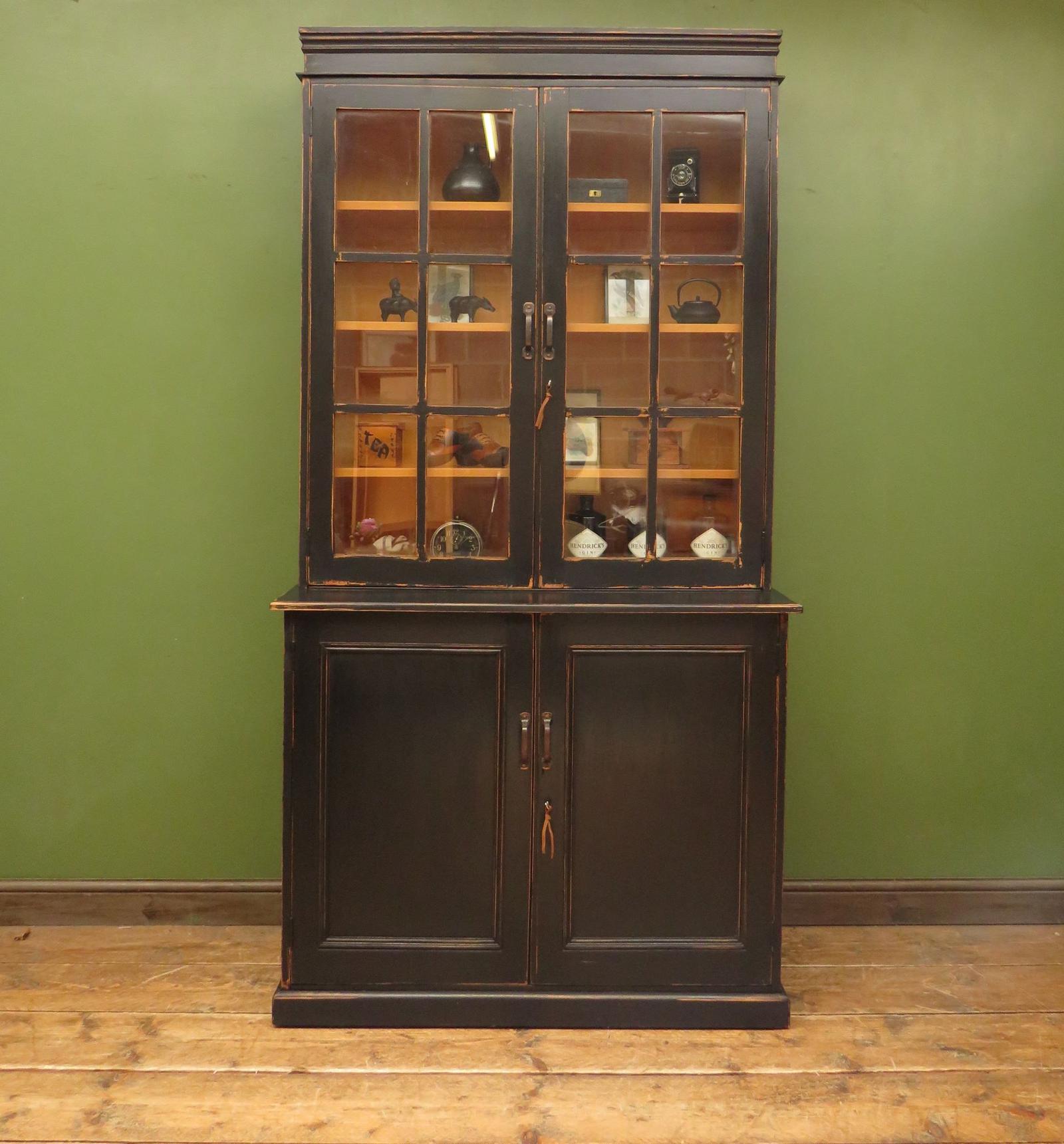 Vintage Black Painted Bookcase Dresser Cabinet with Glazed Top, Lockable, Gothic