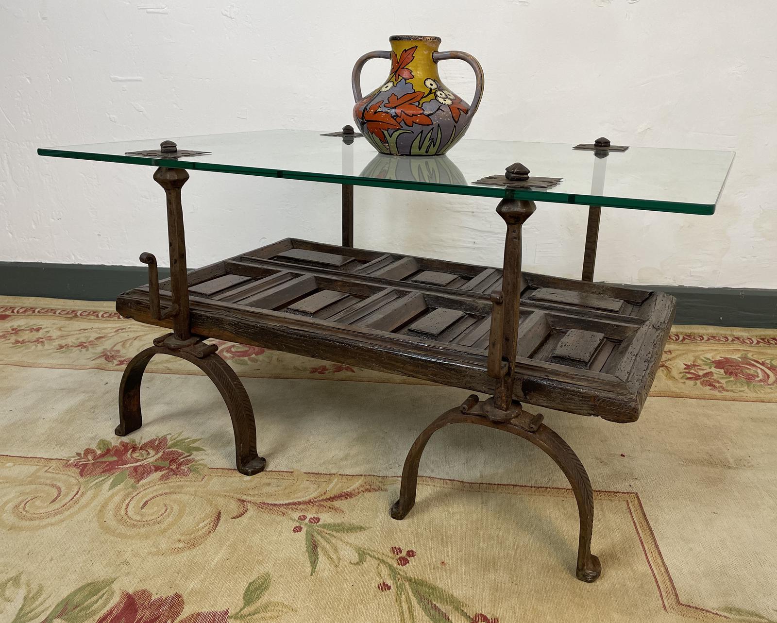 Vintage Brutalist Gothic Artisan Wrought Iron Oak & Glass Coffee Table