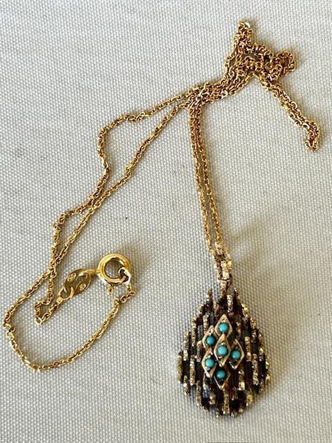 A stunning silver gilt pendant necklace in the Brutalist taste. The pendant and bale have an openwork frame with a textured finish, so popular at the time. Set with six 'sleeping beauty' turquoise cabochons, the pendant is marked 'Sterling' to the back. Supplied with a silver gilt chain, this superb example is a classic period piece with timeless appeal.