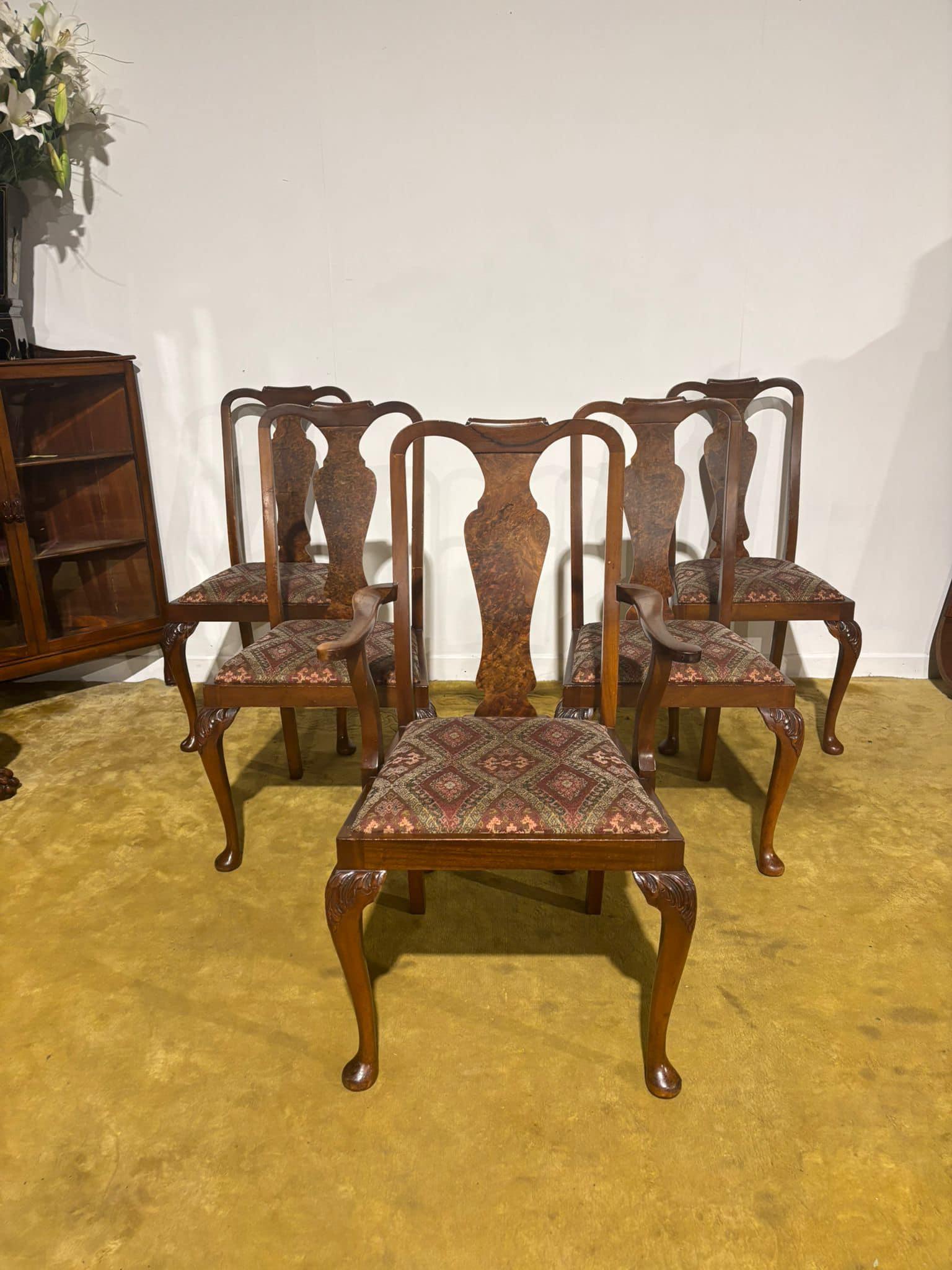 Vintage Burr Walnut Veneered Set Of Five Dining Chairs One of Which is a Carver.