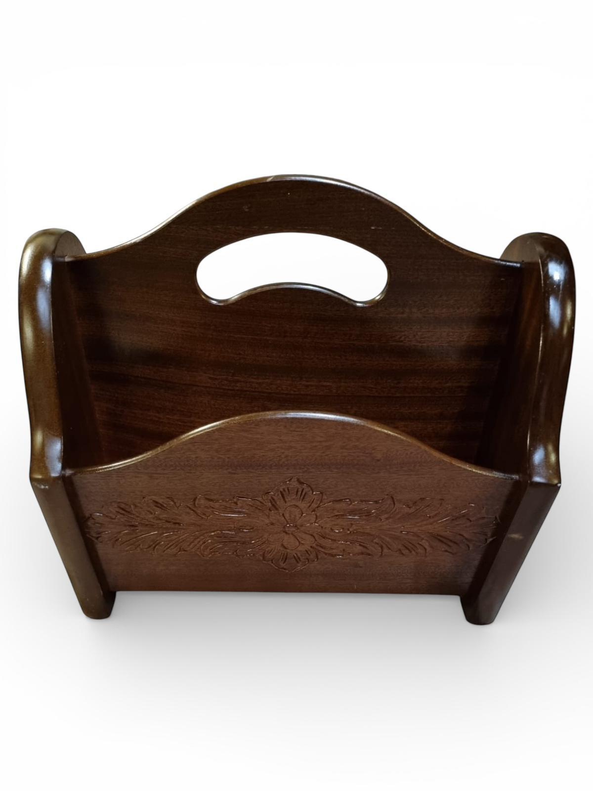 A charming vintage wooden magazine rack dating from the 1960s featuring elegant carved floral detailing to both sides and the front panel.
