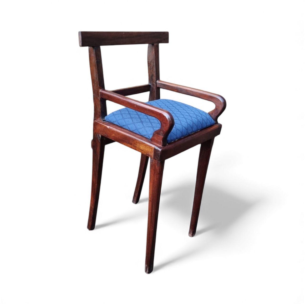 A charming vintage children’s wooden chair, narrow and compact in size, with gently shaped armrests and a simple, sturdy frame.
